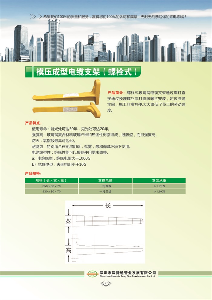 螺栓式玻璃钢电缆支架通过螺钉直接通过预埋螺丝或打膨胀螺丝安装,定位准确牢固,施工非常方便,大大降低了员工的劳动强度
