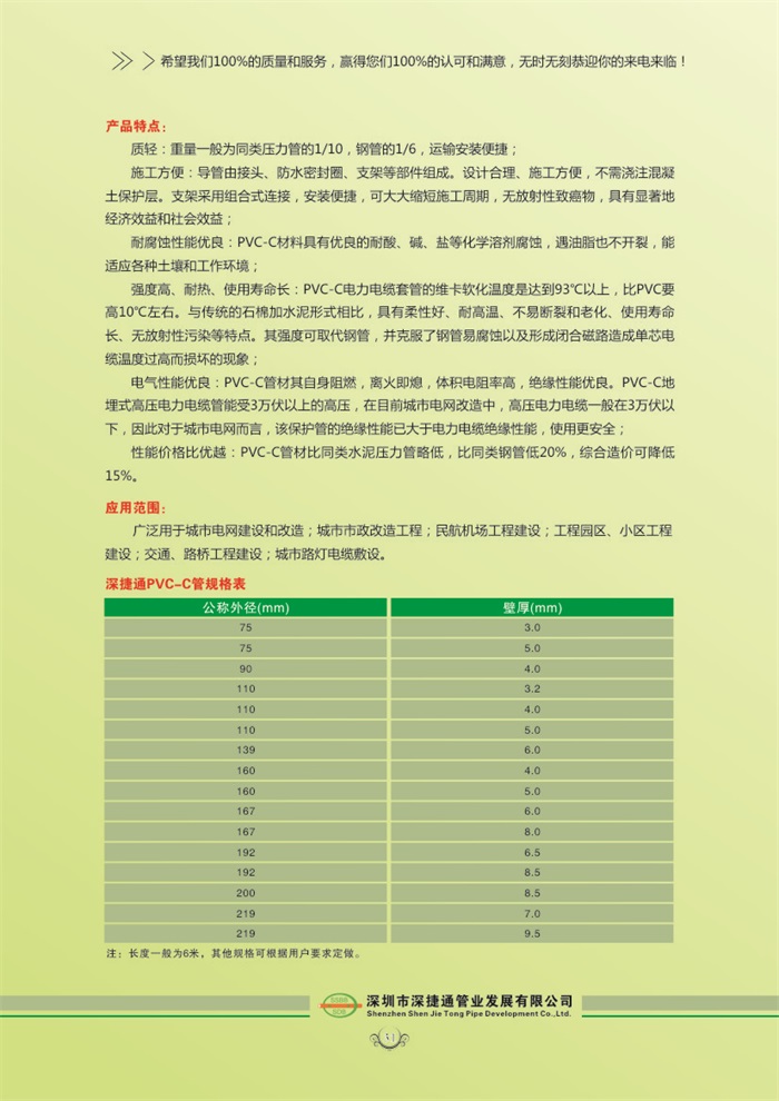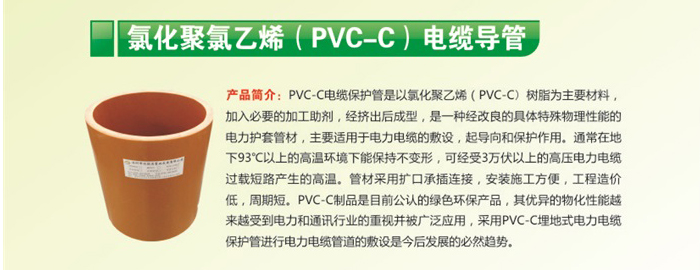 PVC-C电缆保护管是以氯化聚乙烯(PVC-C)树脂为主要材料,加入必要的加工助剂,经挤出后成型,是一种经改良的具体特殊物理性能的电力护套管材,主要适用于电力电缆的敷设,起导向和保护作用。通常在地下93℃以上的高温环境下能保持不变形,可经受3万伏以上的高压电力电缆过载短路产生的高温。管材采用扩口承插连接,安装施工方便,工程造价低,周期短。PVC-C制品是目前公认的绿色环保产品,其优异的物化性能越来越受到电力和通讯行业的重视井被广泛应用。采用PVC-C埋地式电力电缆保护管进行电力电缆管道的敷设是今后发展的必然趋势