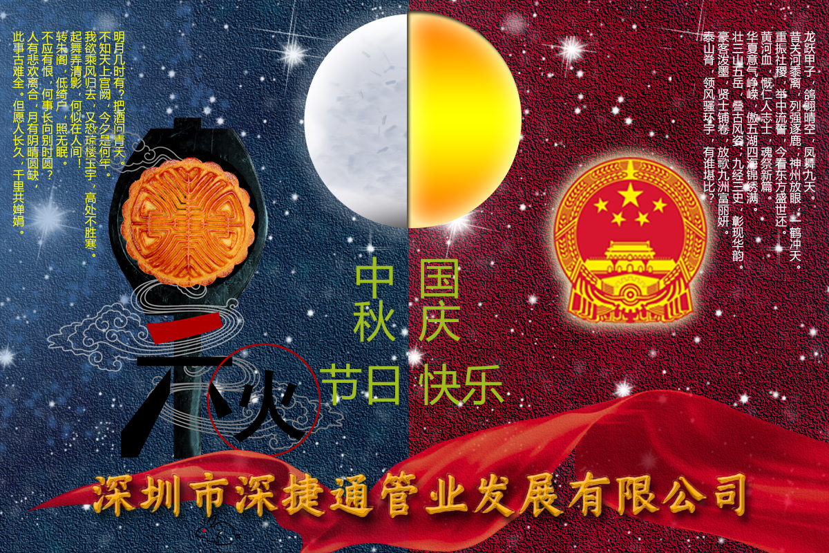 没有多余的话语,只有满满的祝福!深圳市深捷通管业发展有限公司祝大家国庆中秋,双节同庆。